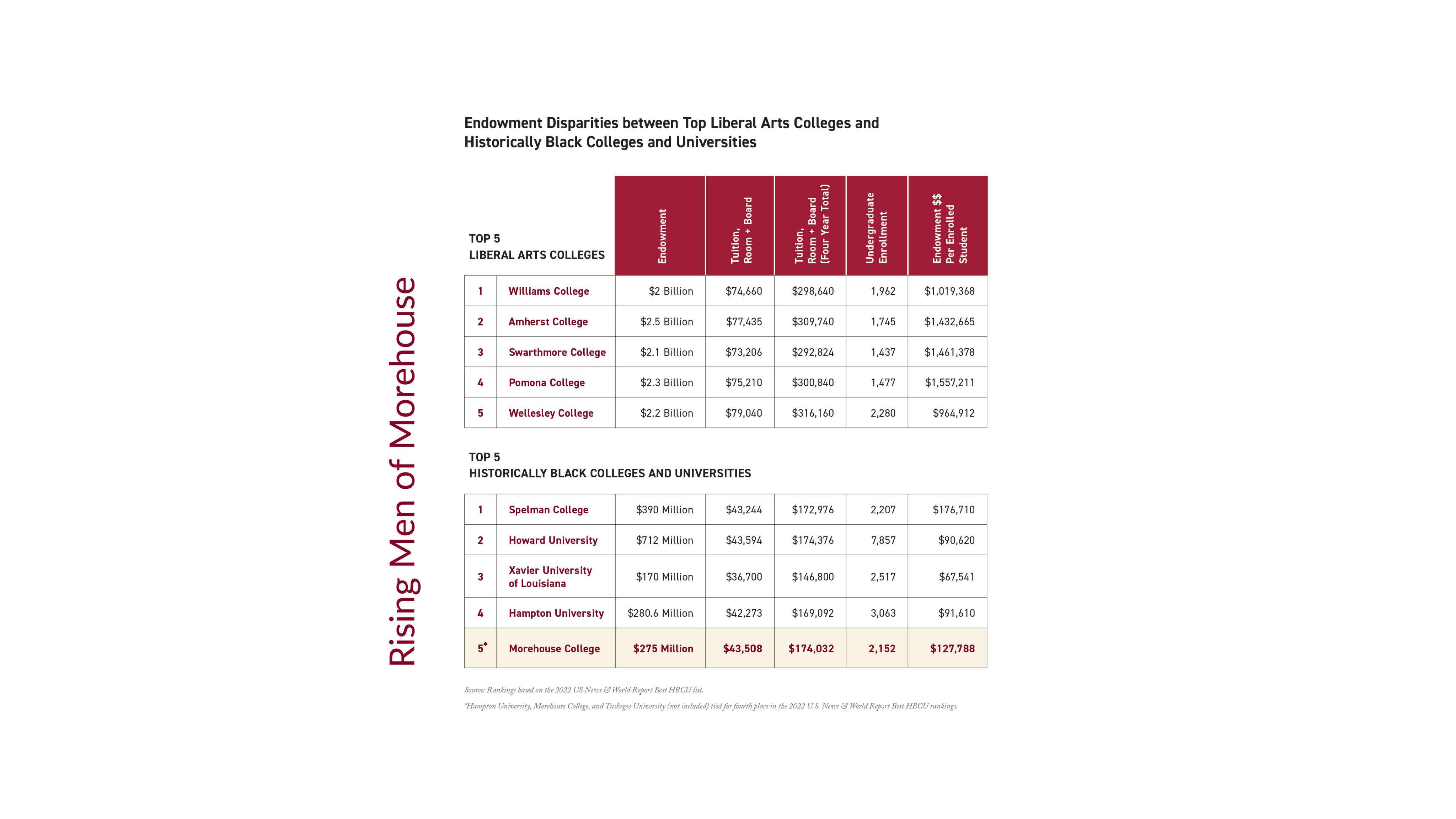(HBCUs), it is impossible to unsee the discrepancy and the competitive financial disadvantage HBCUs face. This presents a longstanding challenge for Morehouse and is one that must be met to ensure we can continue to serve our constituency.